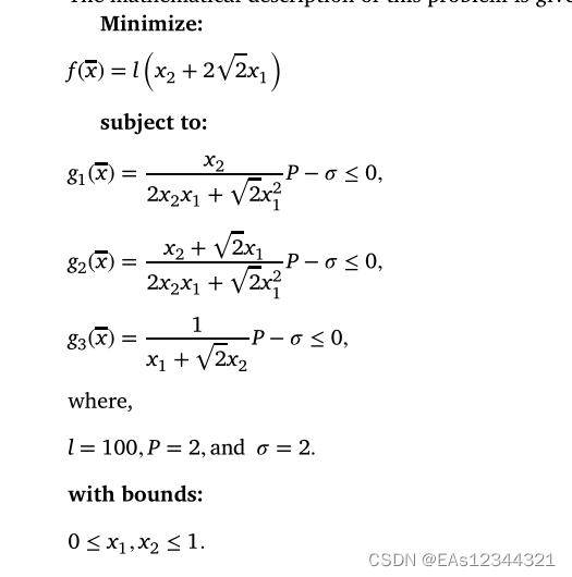 基本介绍:这个优化问题来自土木工程,本质上可建模为一个约束优化问题。这个问题的主要目的是使钢筋结构的重量最小化。这个问题的约束是基于每个钢筋的应力约束。由此产生的问题具有三个非线性约束的线性目标函数。类似于多数文献,采用罚函数法处理此类工程设计问题。该问题的数学描述如下: