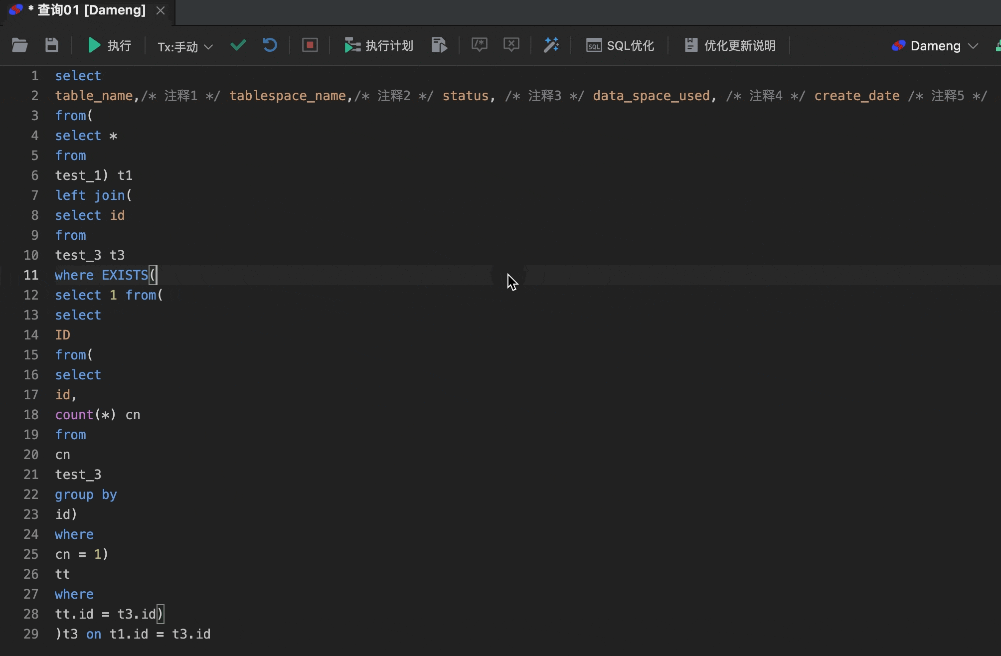 在多层嵌套的 SELECT 语句中 ,对 FROM、WHERE、LEFT JOIN、EXISTS、ORDER BY 等子句换行左对齐,增加明显缩进,代码层级更加明显;对于 DDL 语句优化了 CREATE VIEW/FUNCTION/PROCEDURE 等语句格式化后完全乱序的问题;对 DMSQL 代码块中的 CASE 语句、BEGIN…END 代码块进行了优化;如果一行代码的中间插入有注释信息,则格式化后该注释跟随该行,不再换行显示。