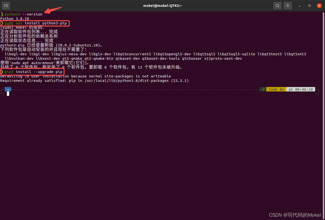 接下来,我们需要先通过pip在命令行中安装dronecan_gui_tool上位机,理想情况下,你的Ubuntu应该与我的一样,最低为Ubuntu20.04 LTS版本,因此系统自带的python版本为3.x系列,比如我这里是3.8.10,如果你的Ubuntu系统的python版本较低,推荐你更新为python3.x系列;另外一方面,如果你之前未安装过pip,或者你已经很久没有更新过pip了,那么你需要依次执行sudo apt install python3-pip、pip3 install --upgrade pip安装和更新pip。