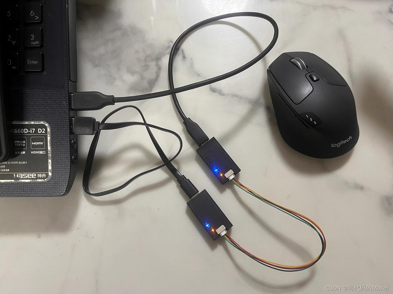 然后我们关闭已经打开的droncan_gui_tool上位机,先将两个Pogo-DroneCAN调试器的GH1.25口通过一根双头反向端子线连接在一起,然后将调试器通过TypeC线连接到电脑上,你应该还记得我们在第2期视频中提到在Windows下直接使用dronecan_gui_tool上位机连接Pogo-DroneCAN调试器时需要依次将调试器连接到电脑,现在我们是在Ubuntu系统下直接连接调试器并通信,不再受到此约束。