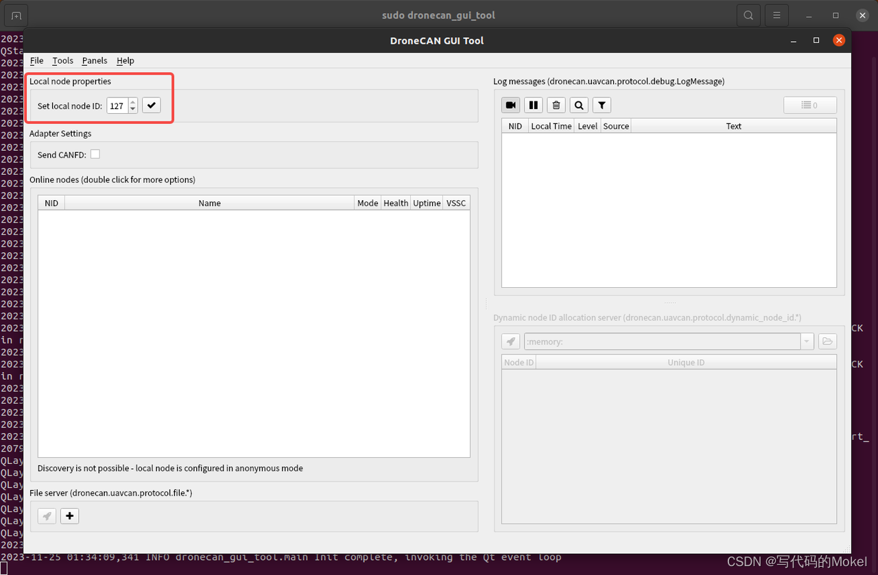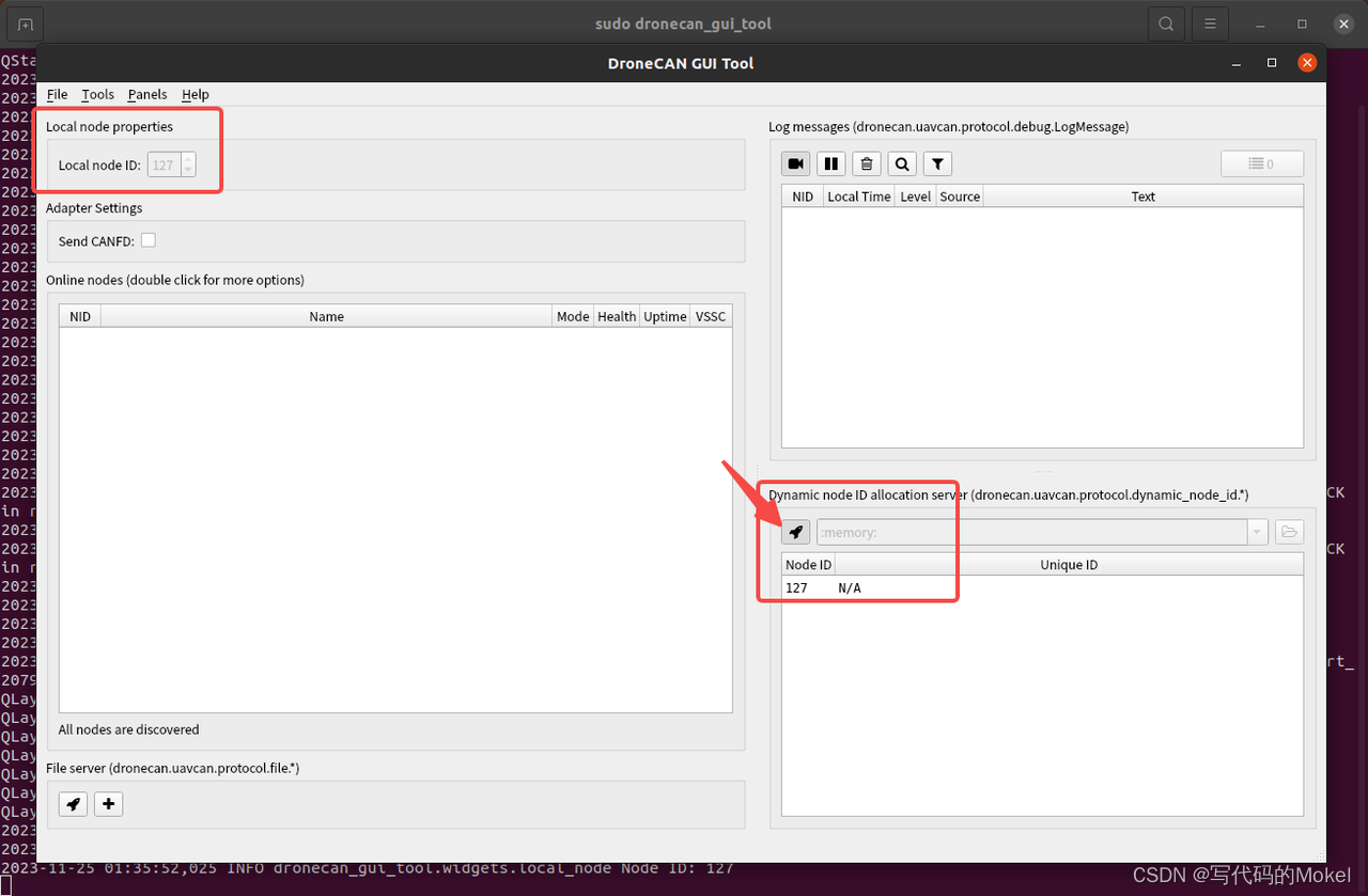 重新在命令中执行sudo dronecan_gui_tool打开上位机,可以看到在Select CAN interface选项中有两个新设备,他们分别对应连接到电脑的两个DroneCAN调试器;选择第一个设备,然后点击下方那个的ok按钮进入dronecan_gui_tool上位机主页面,然后点击左上角的 √ (对勾)设置local node ID,比如我这里设置为127,再点击右下角的小火箭,dronecan_gui_tool上位机会识别到我们已经连接到电脑的DroneCAN调试器,它的节点ID为127。