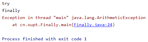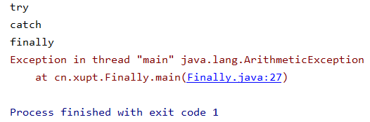 2:如果catch中出现异常finally还会执行吗?再运行一下: