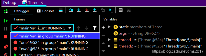 切换到one线程使之执行完发现控制台打印: