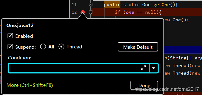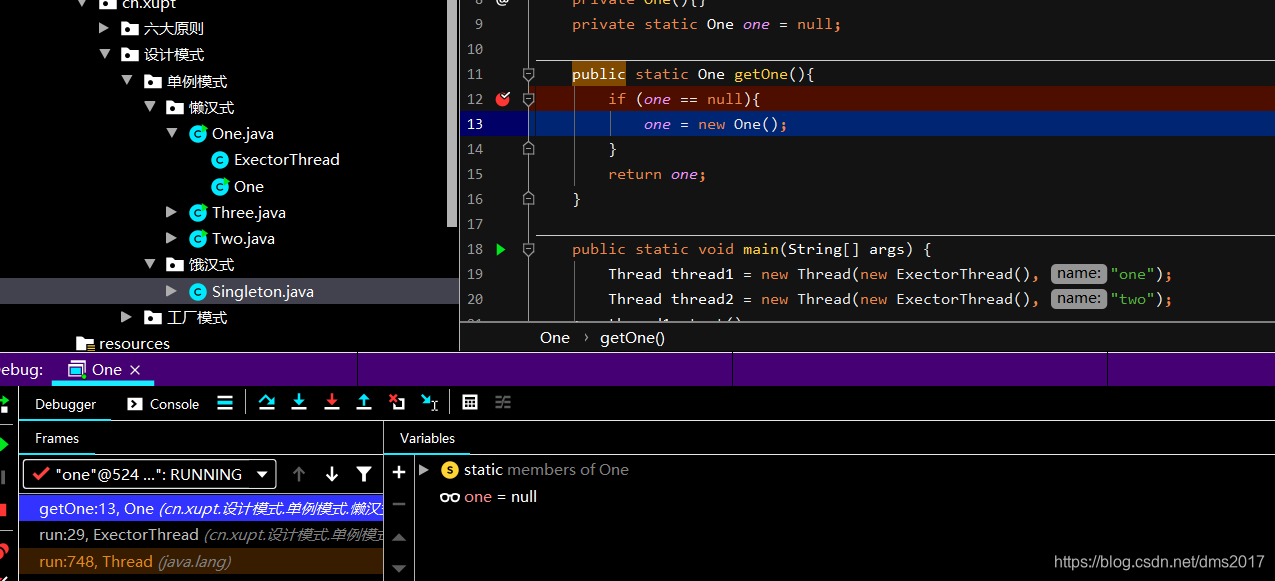 大家可能已经看出来了,这个程序两个线程可能输出不同one对象,这个情况我们可以用线程模式的debug模拟出来:
