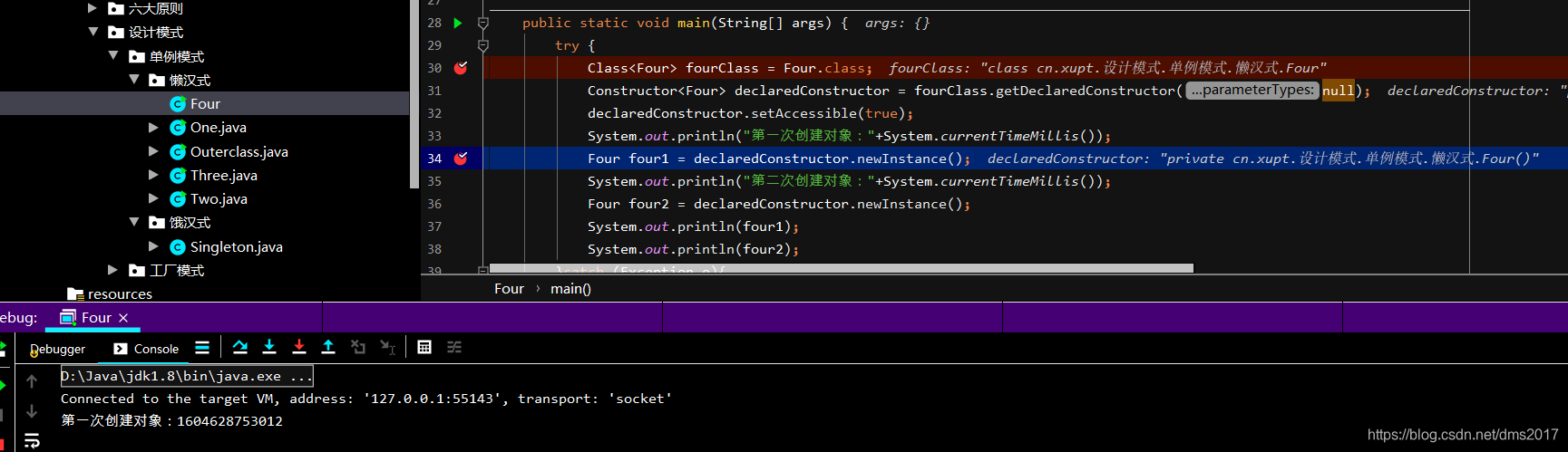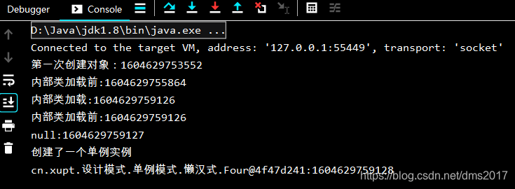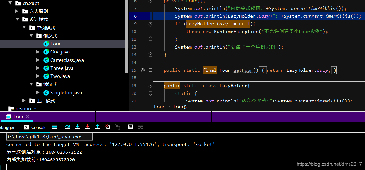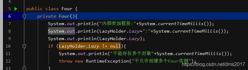 当Four类加载时,代码中的LazyHolder静态内部类默认是不加载的(JVM类加载机制),只有调用getFour()时才会new一个Four()对象,而static和final保证了单例的唯一性和不变性。