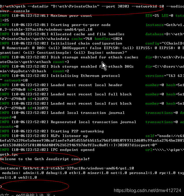 这个已经启动成功了,可以看到我们接着进入到了geth控制台,可以进一步输入一些命令了。
