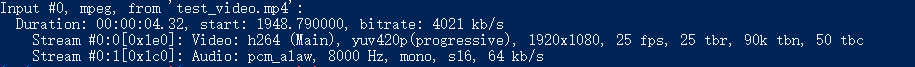 使用查看视频文件命令 ffmpeg -i test_video.mp4 得到视频消息如下: