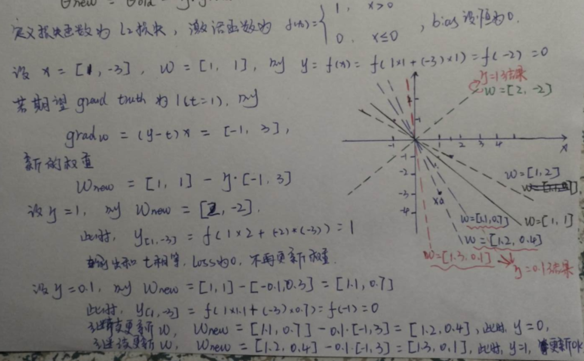 依然使用L2损失,使用上面的结果,在bias恒为0的情况下,在下面例子中,可以通过持续的权重更新最终使的 y = f(x) = t。从下面例子中也可以看出,较小的学习率(learning rate)虽然会使得求解过程稍慢,但最后求得的目标函数较学习率(学习率为1, w=[2, -2])较大的目标函数更“精准”;