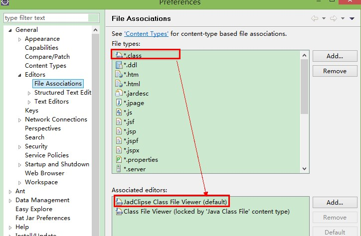 6.继续配置File Assocations,让*.class默认关联编辑器是JadClipse class File Viewer(default)。