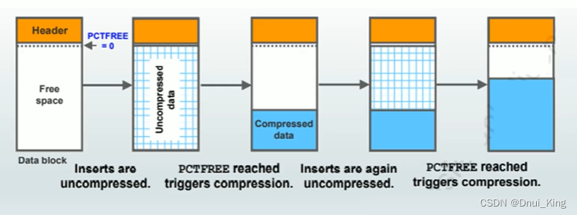 例如:数据块可用空间只剩下百分十10,触发压缩,把原来块的数据进行压缩,腾出来一部分空间来存放新的数据,再进行insert操作后,可用空间又只剩下百分十10,再一次进行压缩。