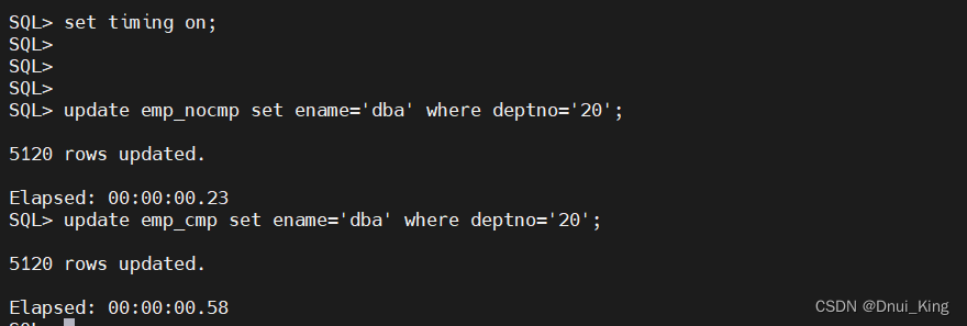 打开计时器,对表进行update操作,比对压缩表和非压缩表效率: