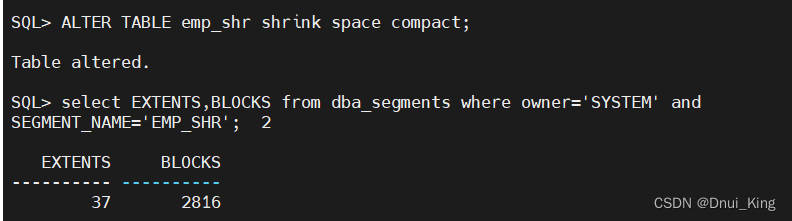 如果块中发生大量的delete操作,导致块中的行不紧凑,浪费了大量块空间,我们可以通过shringking 操作回收空间,降低高水位线,从而高水位线以上的块就会被回收。