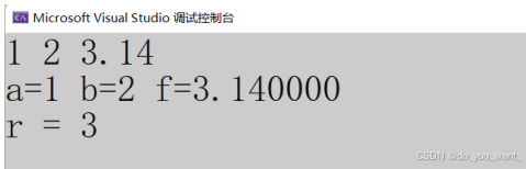 上⾯⽰例中,格式字符串 %d%d%f%f ,表⽰⽤⼾输⼊的前两个是整数,后两个是浮点数,⽐如 1 -20 3.4 -4.0e3 。这四个值依次放⼊ i 、 j 、 x 、 y 四个变量。