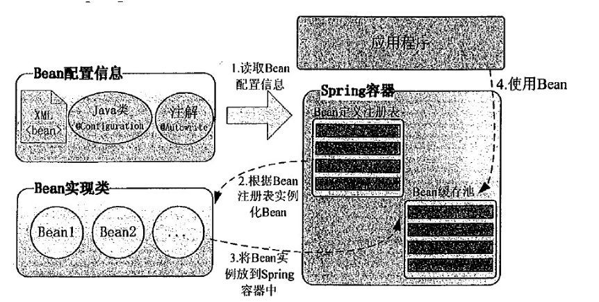 (1)spring容器会根据含有Bean配置的XML文件(spring.xml),把配置文件的Bean配置信息与spring容器中Bean定义注册表相对应起来;