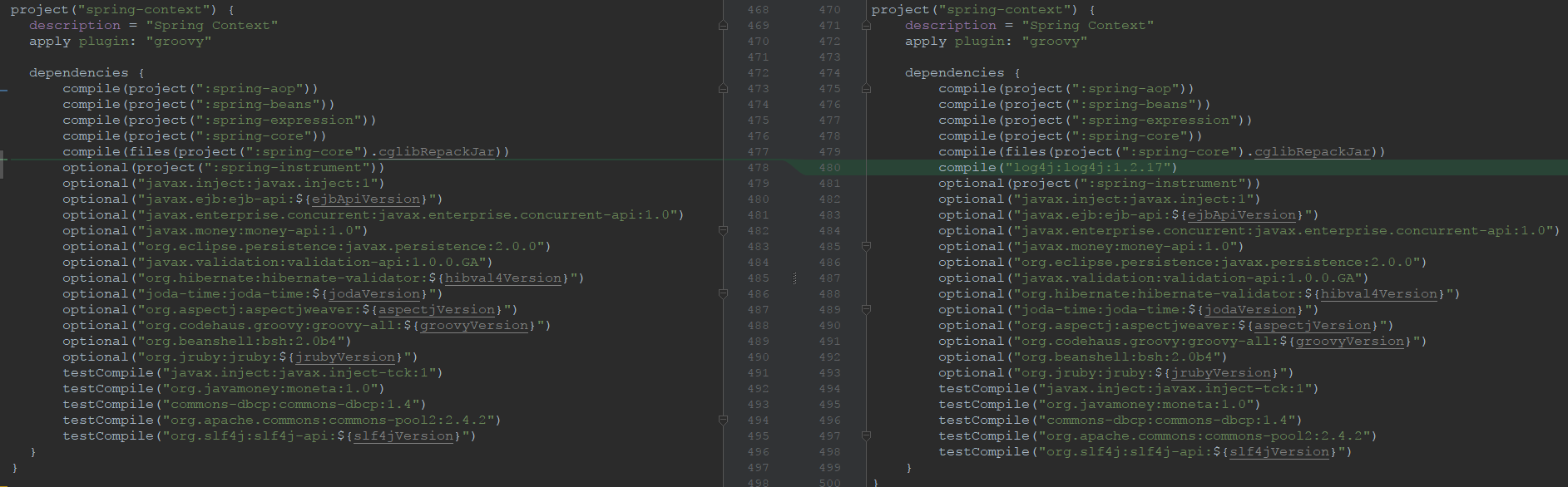 依旧可以清晰地看到,Spring下的十几个模块在 build.gradle 文件中都有类似于 project("spring-core") 这样的关键字。在这其中还可以看到 dependencies 关键字,不用想,这和Maven中的 dependencies 一样,就是依赖了。