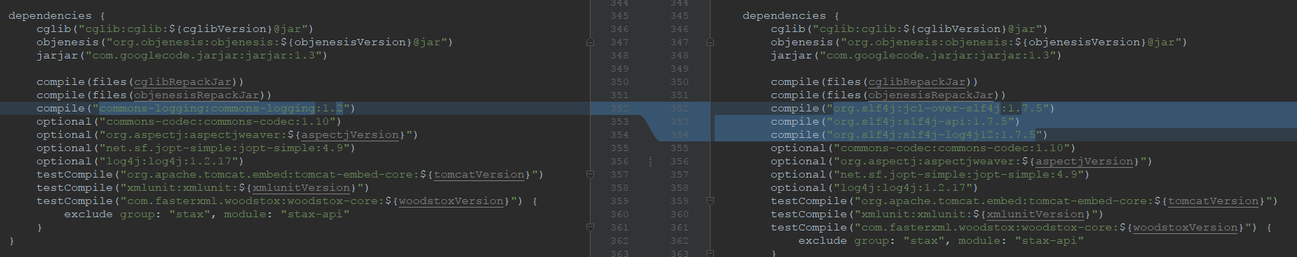 对Gradle不熟悉,所以,虽然问题是解决了也可以正常运行了,但是,RootCause还是不清楚。而且从上述截图中也可以看到 spring-core 的依赖中已经有 optional 的 log4j 依赖了,而我之前是直接把这个 optional 改成 compile 了,会不会有影响?而最后能正常运行的时候,这个 optional 的 log4j 仍然是存在的,只是在 spring-context 中添加了 compile 的 log4j。