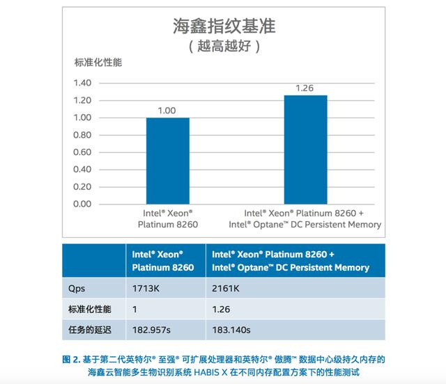 海鑫科金在两套环境中运行同样的海鑫HABIS X指纹比对系统,并测试其记录查询性能。结果表明,采用傲腾数据中心级持久内存方案的记录查询速度(单位:QPS)比纯DRAM方案高出26%(如图2所示)。