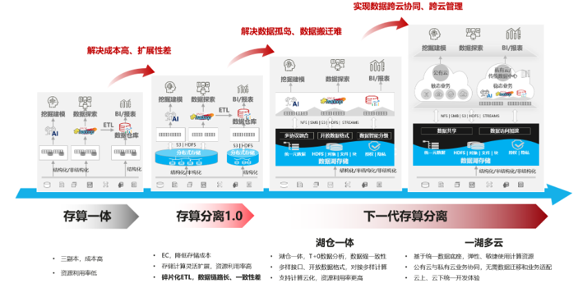 华为海量存储在商用的存算分离1.0方案满足降成本的客户需求后,当前率先在存储上支持湖仓融合的新兴数据格式,在下一代存算分离架构下,基于一份数据支持接数据湖、数据仓库同时访问。提供以业务为中心的高弹性大数据计算,以数据为中心的高性能海量存储,用户无感知的原生HDFS和S3兼容能力,进一步向湖仓一体、一湖多云、实时分析演进。