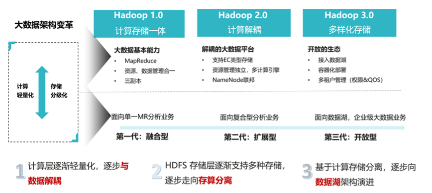 而在Hadoop三代版本的演进中证明了存算分离已成为大数据建设的必然趋势。