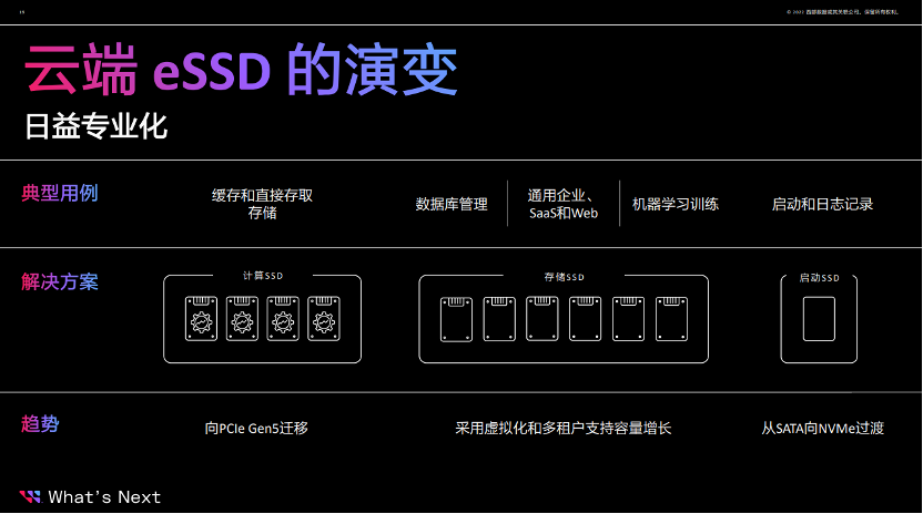 - 针对数据库、企业级SaaS、虚拟化、机器学习等应用,需要存储型SSD,能够提供性能和容量上的保障,还兼顾TCO的优势,广泛用于虚拟化、多租户等场景的性能和容量支持。