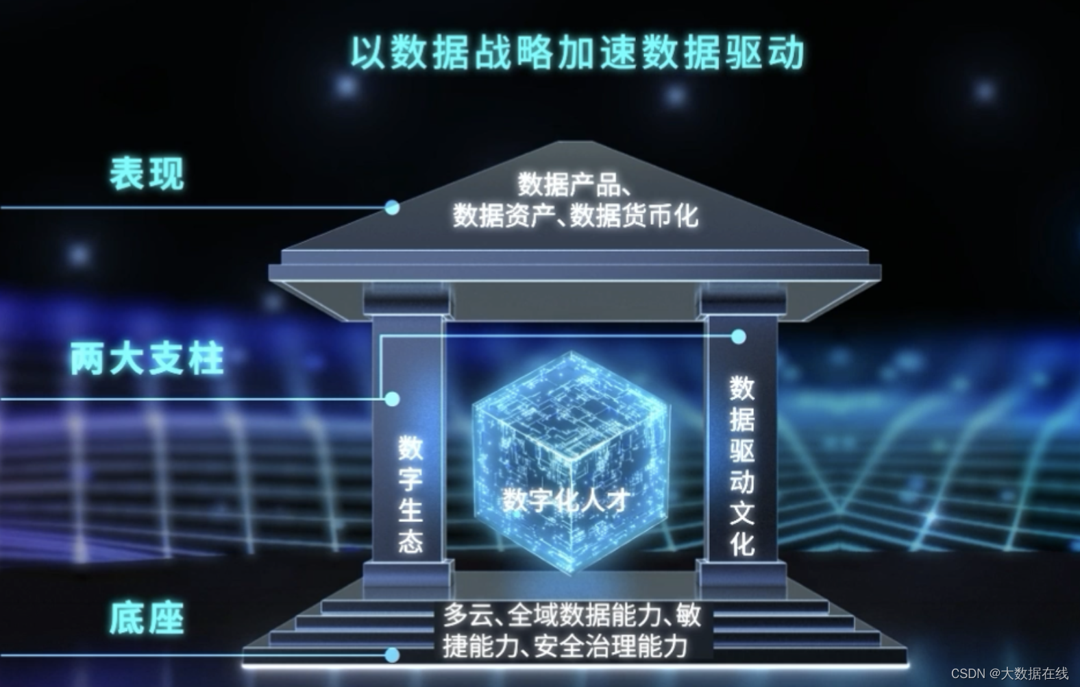 - 其次,组织内部需要建设和沉淀数据驱动文化、数字生态两大支柱,让能力底座支撑业务的发展和生产力的提升;