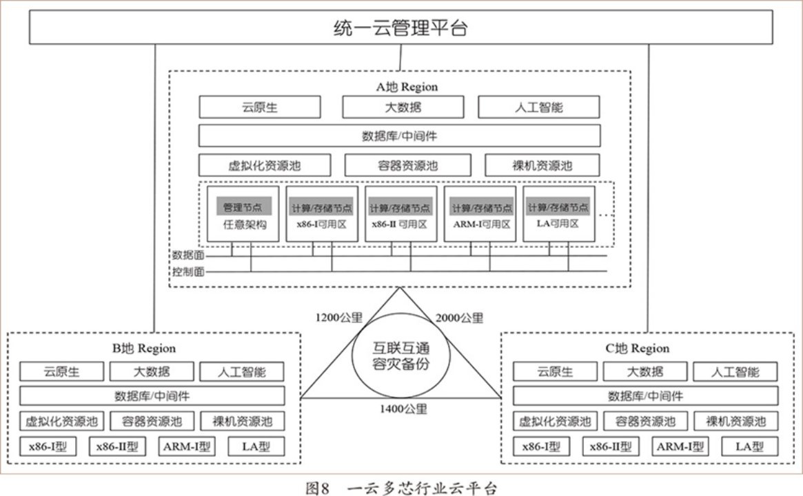 在基于InCloud OS建设的云平台中,单资源池支持所有主流处理器架构,并按每个控制器1000个节点级联扩展,实现了相距超过1000公里的三地数据中心一云多芯跨域统一管理、互联互通,支撑云数智多样化业务需求,制定了技术规范和参考架构(见图8)。