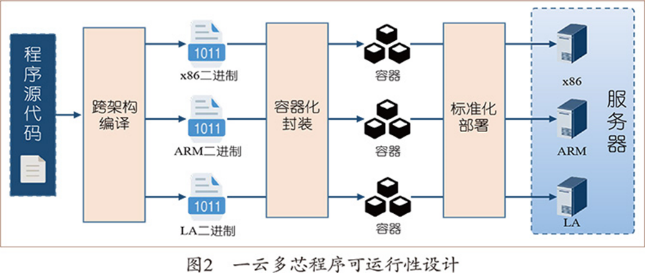 综上所述,一云多芯程序可运行性设计包括三个方面,首先实现应用程序的跨架构编译及运行,其次构建标准容器化封装,最后通过云资源编排管理实现轻量化部署(见图2)。