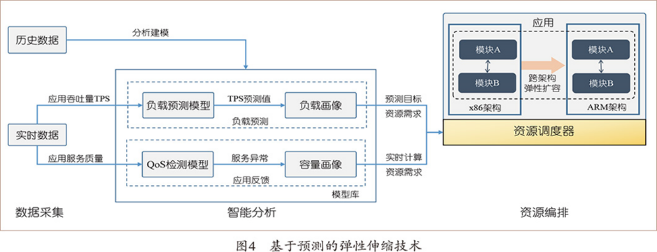 为了支撑面向业务峰值和低谷的弹性伸缩,要做到资源封装的精准规划、快速调度和算力等价,保证应用服务弹得对、弹得快、弹得准(见图4)。(1)在资源规划方面,根据应用负载特定周期内的概率分布特征,基于历史数据时间序列建立负载趋势模型,刻画应用负载、服务质量与资源关系的负载画像和容量画像,通过负载趋势预测和应用异常反馈方式规划资源封装伸缩需求。(2)在快速调度方面,基于架构感知、均衡调度技术,在扩展资源封装时快速调度至最佳节点,并拉起应用服务,保障应用服务及时响应。(3)在弹性伸缩引发资源封装跨架构切换时,基于算力量化技术刻画不同架构的算力,根据有效算力、业务算力计算资源封装的等价关系,确保业务的服务质量随资源增减而线性伸缩。