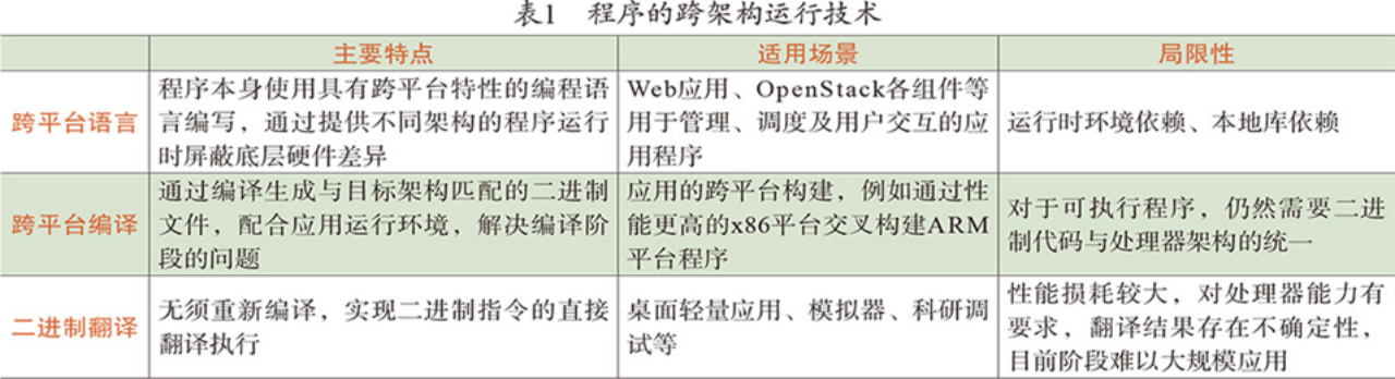 1.程序的可运行性程序的跨架构运行在一云多芯系统中,程序的首要设计目标是可运行性,即可以在不同处理器架构的环境中移植运行,技术路线包含跨平台语言、跨平台编译以及指令翻译技术(见表1)。