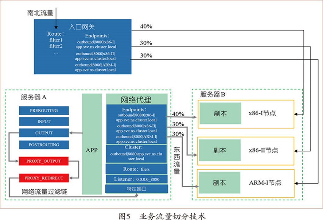 控制面感知副本变化生成流量切分策略,下发至网络代理和网关。对于东西向流量,网络代理劫持流量并根据切分策略按比例转发到不同的副本。对于南北向流量,网关在流量转发时根据切分策略转发到不同副本(见图5)。在流量切分的瞬时过程中,受目标节点副本未启动、TCP连接延迟等因素的影响,会出现无法响应、丢包等应用服务质量下降的情况,可以通过预热、探针、重试、排水技术保障应用跨架构的平滑切换。