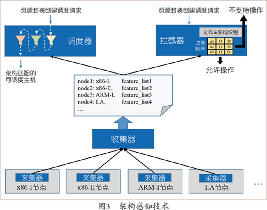 架构感知技术架构感知是一云多芯实现节点调度、界面功能自适应展示的关键,是支撑程序的可运行性、实现资源封装生命周期管理的基础,可通过收集器、调度器、拦截器实现(见图3)。(1)收集器采集并上报各节点的CPU架构、硬件特性等信息,建立包含架构特性的主机列表。(2)调度器为各种粒度的资源封装选择匹配的主机节点,采用级联过滤器机制,加载多个独立的过滤器,依次对创建请求与主机进行匹配。在一云多芯场景下,通过级联架构感知过滤器,识别资源封装创建请求中的镜像架构标签,根据CPU架构特性匹配结果过滤出主机节点。(3)拦截器用于建立可动态扩展的“架构-功能”映射矩阵,解析资源封装管理请求的动作及架构特征,执行拦截请求并将结果反馈展示,从而实现不同架构功能差异化的自动识别、动态扩展,屏蔽底层实现差异,提供统一的资源管理视图。