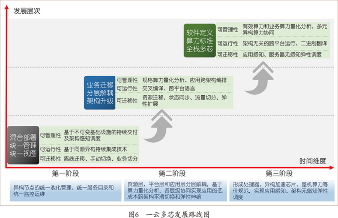 按照资源可管理性、程序可运行性、状态可迁移性系统设计,一云多芯可以分三个阶段逐步演进(见图6)。