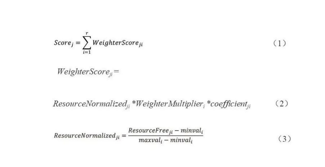 节点j的得分Scorej是r种资源类型权重得分之和,包括CPU、内存、硬盘等,如式(1)。各资源类型权重得分算法如式(2),其中,ResourceNormalizedji为节点j资源i可分配量的最小-最大正向归一化,如式(3)所示;WeighterMultiplieri为资源的权重,可根据负载的CPU、内存或IO密集类型调整权重,体现每种资源的重要程度,coefficientji为各资源的规格算力系数,例如,ARM型和x86型CPU的规格算力量化关系为1∶2,规格系数分别为1和2,可分配CPU核数相同的情况下,x86型节点被调度的优先级更高,从而实现一云多芯场景下基于算力量化的均衡调度。