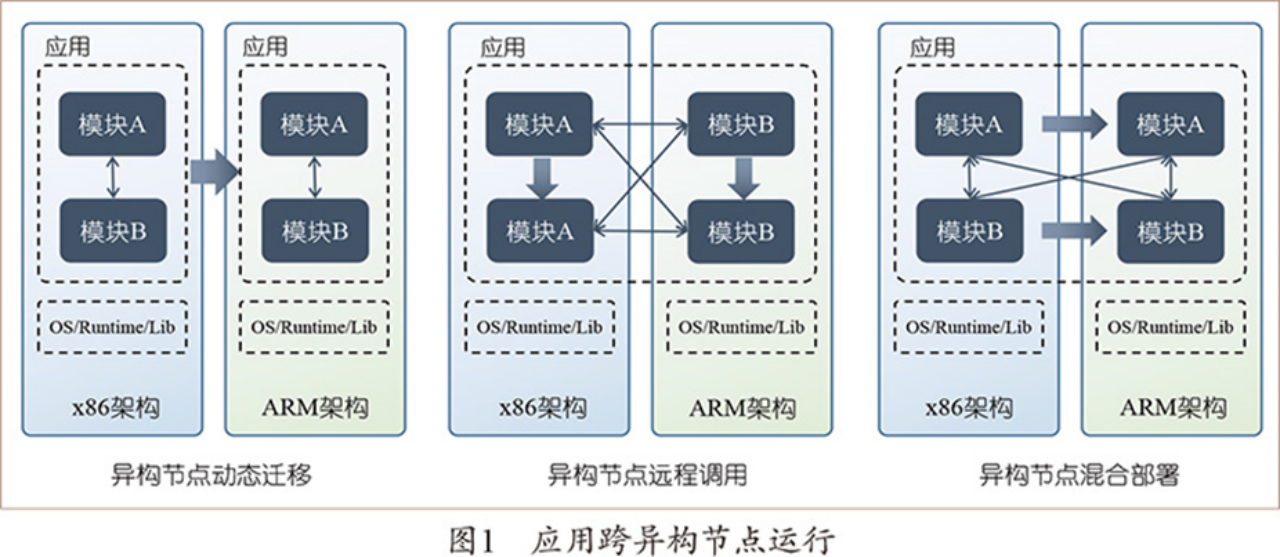 1.应用跨架构可移植及运行环境等价性问题。应用程序运行在多芯系统不同处理器架构的节点上,首先需要确保程序本身的跨架构可移植。进一步,层次化、模块化的复杂应用在异构节点间进行动态迁移、远程调用或水平扩展,如何保障运行环境(操作系统、运行时、依赖库等)的跨架构等价可执行成为挑战(见图1)。