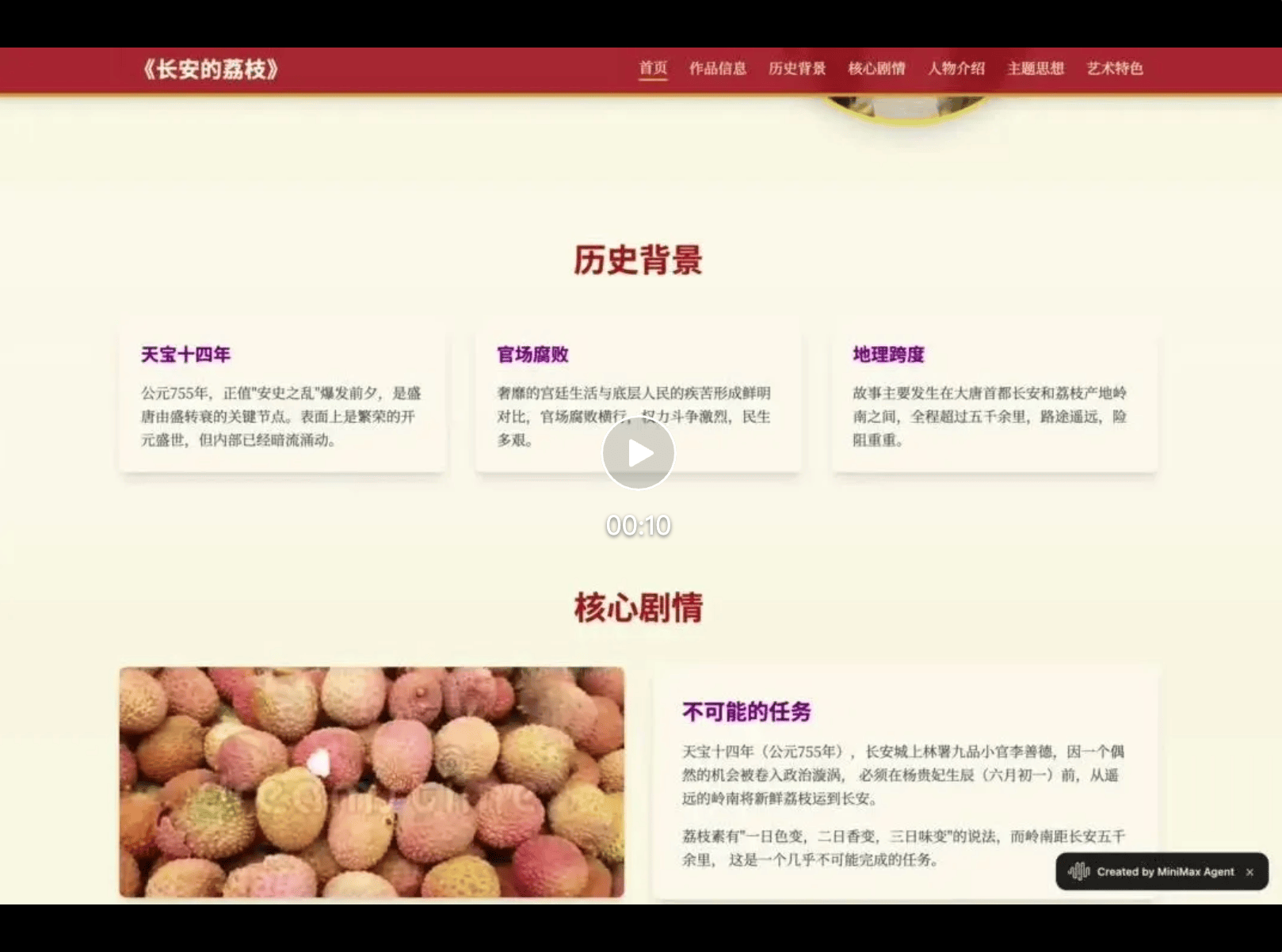 无论是做一套中学物理课件,还给《长安的荔枝》做一个剧情介绍网站,MiniMax Agent所制作的PPT均是排版灵活、视觉美观,网页更像是文化机构做的宣传站点,甚至能用3D 动态演示发动机的四个冲程,效果能直接用于教学。