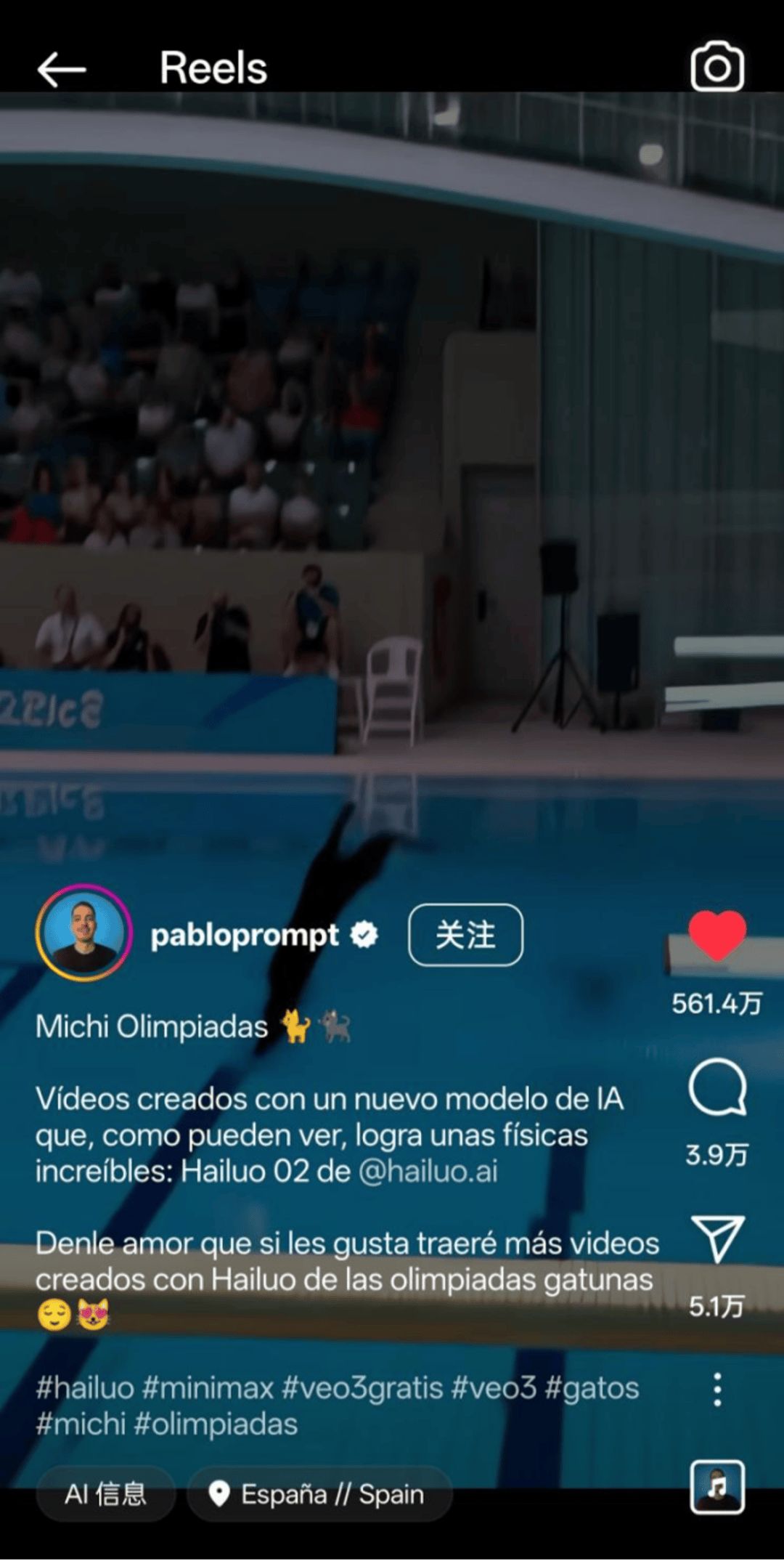 据介绍,这是目前全球唯一一个可以实现类似高复杂物理场景的视频大模型。一经发布,海外社交媒体上便充满了Hailuo 02生成的高难度动作视频,其中一个猫咪跳水的视频5 小时就引得超过全球上亿人围观。