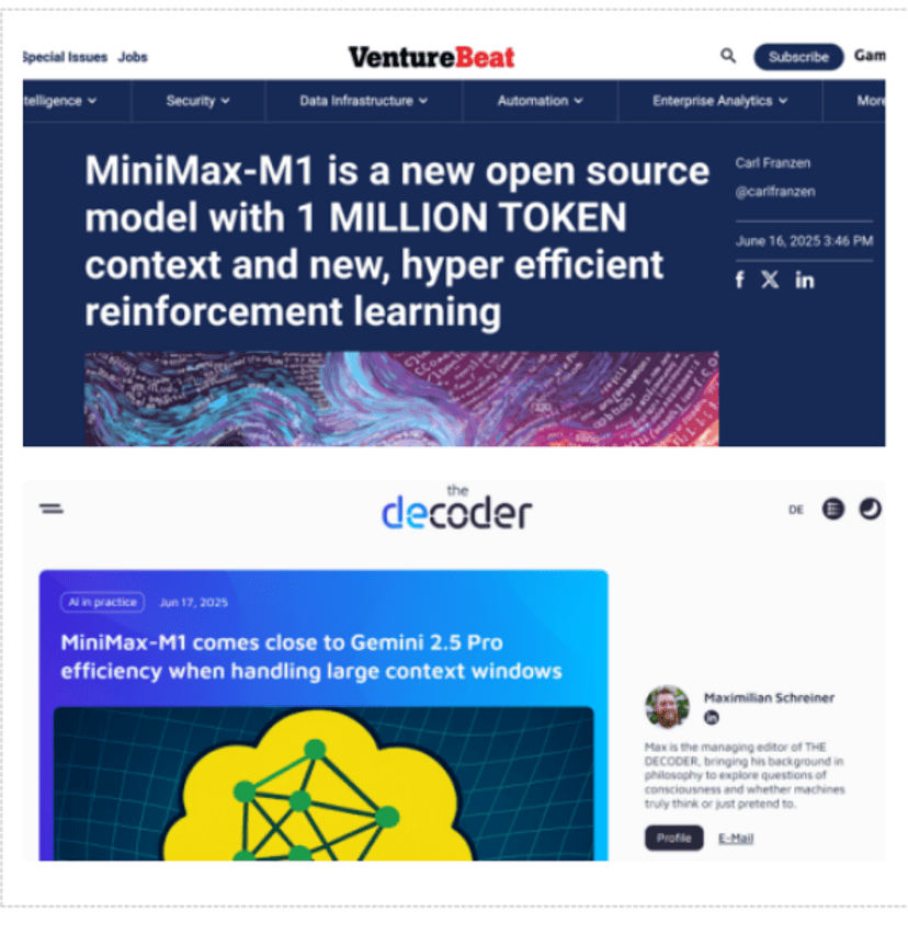 社交平台X知名AI博主MinChoi评论称,MiniMax-M1简直可以说集Manus 、Deep Research、计算机技能和可爱于一体,随即他还展出了自己用MiniMax-M1做的10个有趣案例;美国知名科技媒体 VentureBeat 称为“正在搅动全球模型格局”,并成为当前开源体系下极具代表性的高性价比大模型;科技媒体The Decoder 则将其性能对标 Google Gemini 2.5 Pro,进一步印证了 MiniMax 在全球技术版图上的崛起地位。