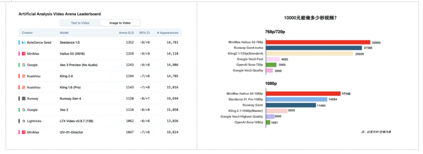 在国际权威测评榜单Artificial Analysis视频竞技场中,Hailuo-02一经发布便迅速拿下全球第二的宝座,领先于Google Veo3和快手可灵(Kling)。