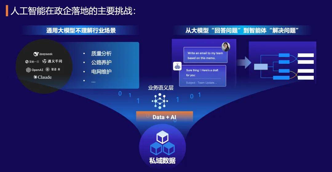 例如,其本体引擎可以帮助企业与组织构建起全局业务知识网络,从而形成一种业务语义层,将数据赋予业务含义,使大模型能“理解”业务场景各实体之间的关系,最终将垂直行业的业务知识转化为系统可执行的智能决策。另外,爱数智能决策平台的VEGA数据虚拟化引擎、ISF 信息安全编织架构等实现可信AI,确保了从数据->知识->智能体->决策的全链路数据安全;而基于业务知识网络+行业引擎,则构建真正懂业务的智能体,为各行各业提供精准、高效的决策支持。