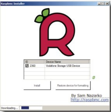 为树莓派安装 Raspbmc 就和在 Windows 上安装普通软件一样。首先下载 Raspbmc 安装文件。一旦下载完成,在读卡器上接一个空的、格式化过的 SD 卡,然后解压并运行