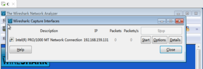 3.进行Wireshark抓包准备工作:选择捕获接口为Intel PRO/1000 MT,指定IP地址为192.168.159.131,点击“Start”按钮开始抓包,Packets计数器实时显示增长。