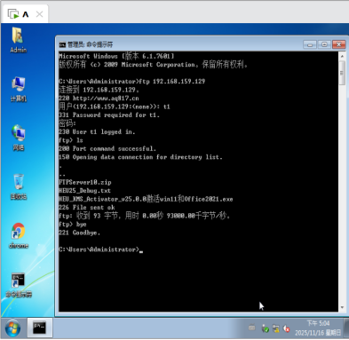 1.在命令行中执行 `ftp 192.168.159.129`,使用用户名 `t1` 和密码 `t1@xyz` 成功连接至本机搭建的简易FTP服务器,完成目录浏览操作后退出。