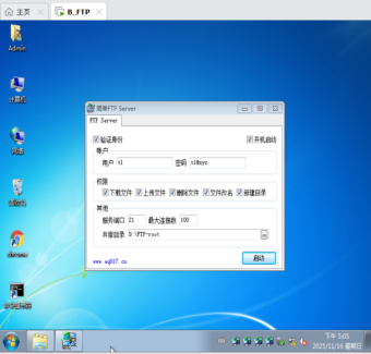 2.简易FTP服务器界面显示如下信息:服务端口为21,最大连接数100,共享目录设置为 `D:\FTP-root`,已启用下载、上传、删除等权限,账户 `t1` 的凭据与登录信息一致。