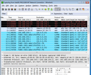 4.抓包过程中,捕获列表中可见ARP、TCP Keep-Alive、NBSS等局域网控制报文;主窗格展示以太网→IP→TCP的分层结构,证实嗅探功能正常运作,为后续数据分析提供了原始数据支持。