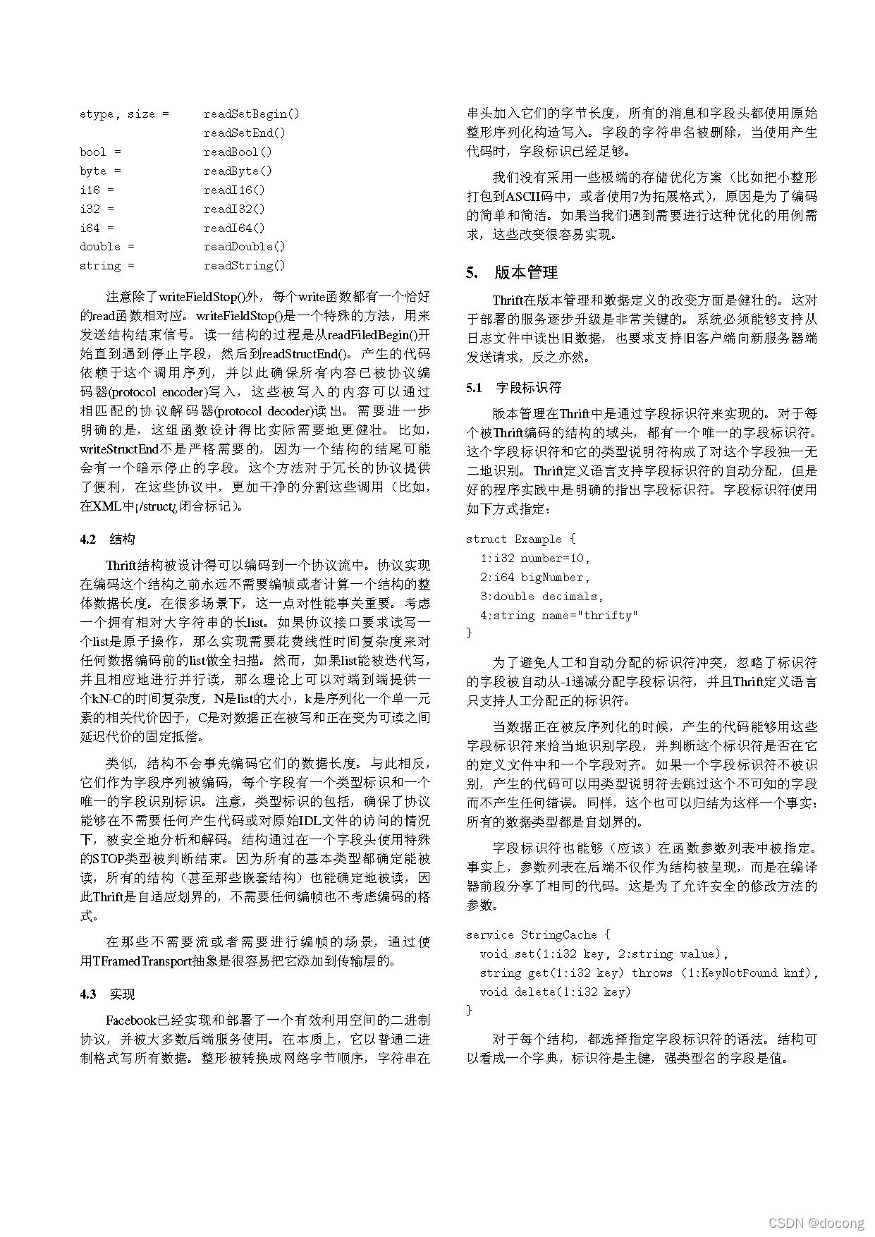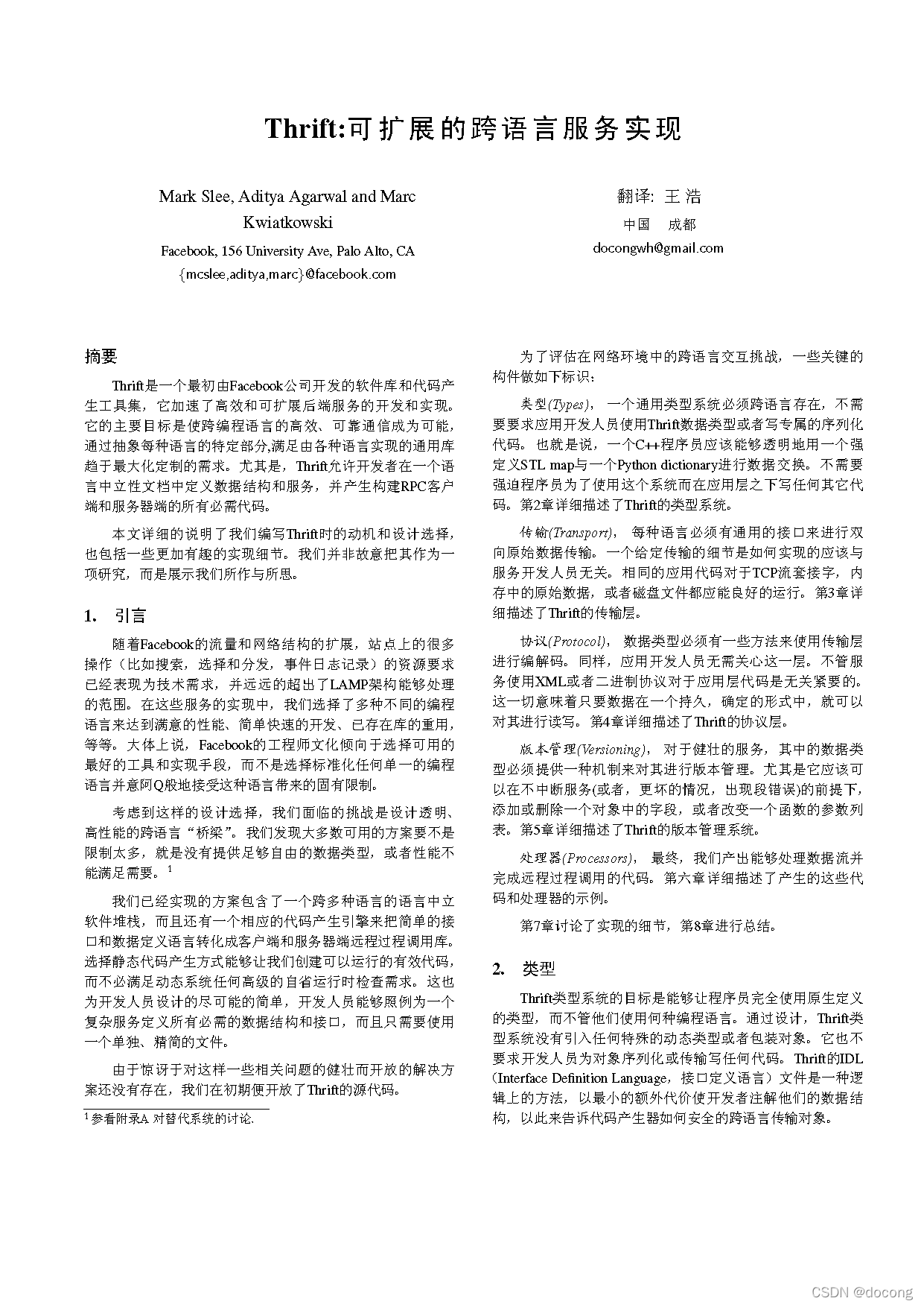 由于各种原因,产生了 对Thrift白皮书进行全文翻译的兴趣,原稿来源于apache thrift项目官方网站thrift-20070401 PDF文档,原文档使用TeX排版,采用ACM SIGPLAN(Special Interest Group on Programming Languages)提供的样式,翻译稿亦采用TeX排版(具体讲,应该是CTeX套件),对SIGPLAN的样式进行了进行了少许的汉化,以生成合适的中文式样,全文共1万多字。TeX源文件和编译后的pdf文件已经打包,并提供下载:
