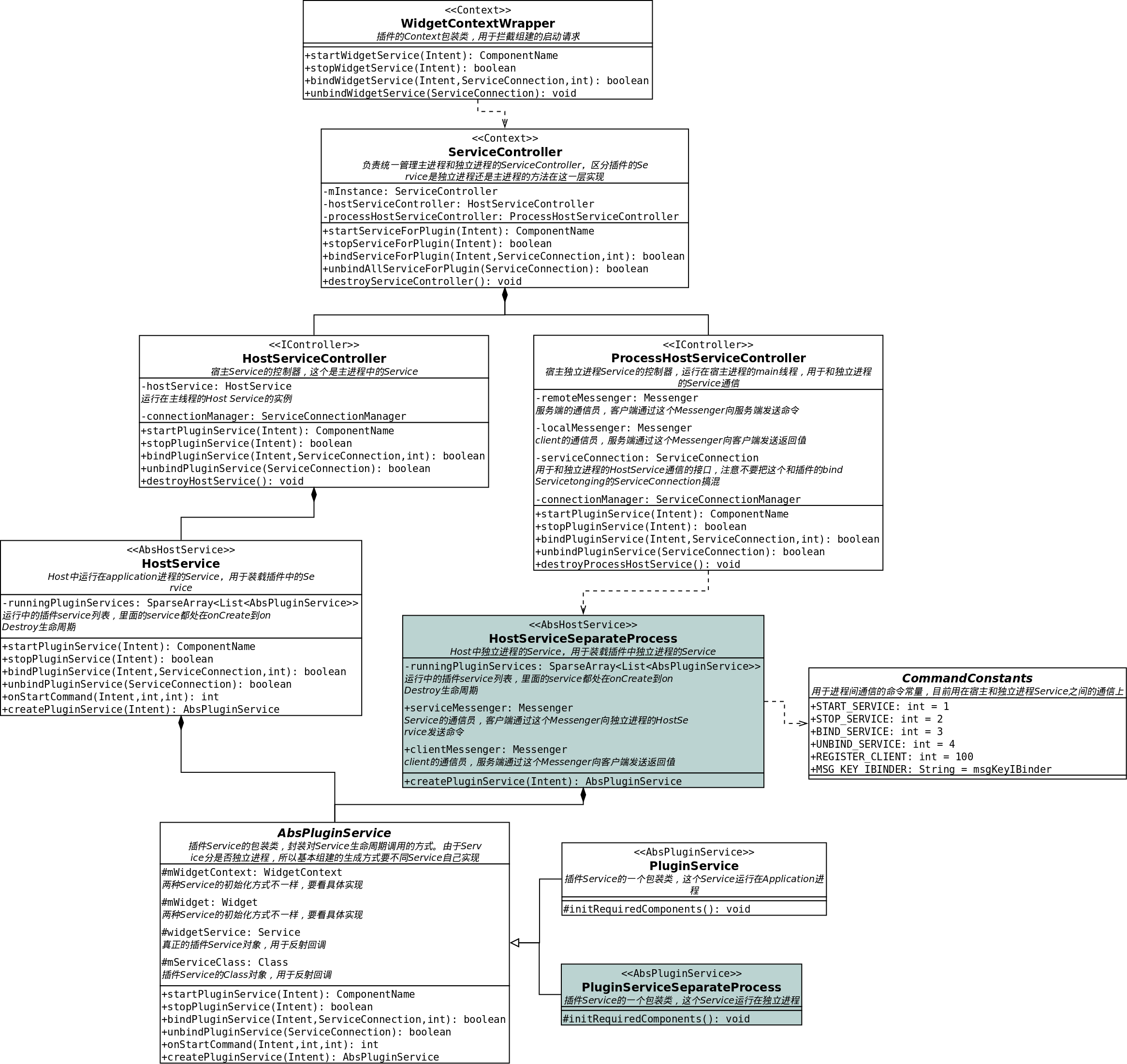 - 由于Android系统中同一个Service只会存在一个实例,这点与Activity不同,所以考虑用框架模拟Android系统来维护插件的Service。Service本质上分为两种,运行在独立进程和非独立进程的,所以宿主应用至少需要启动两个Service,用来装载插件的不同Service。