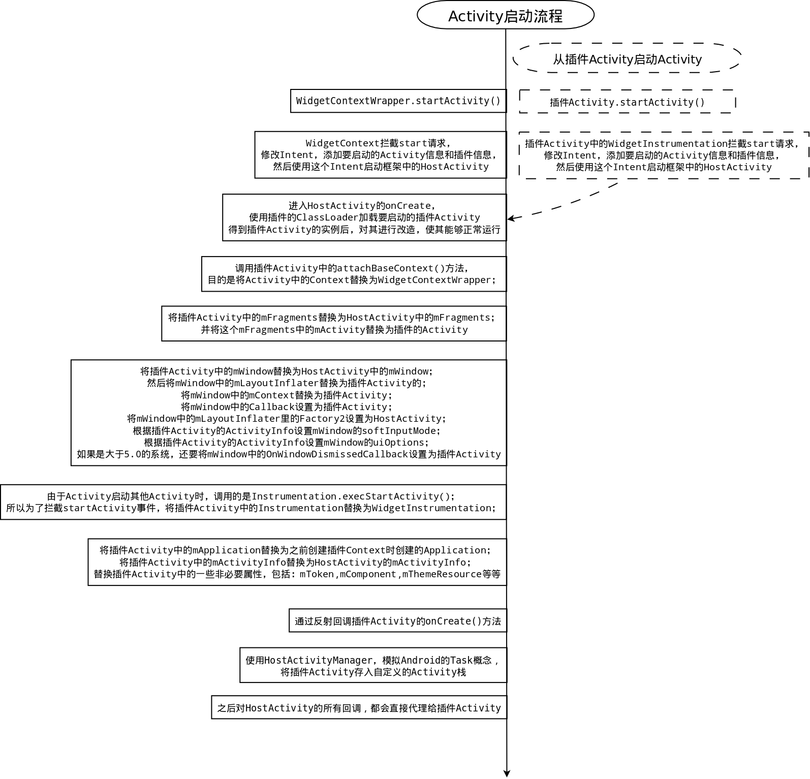 - 通过启动HostActivity来代替插件Activity,也就是说一个HostActivity对应一个插件Activity。
