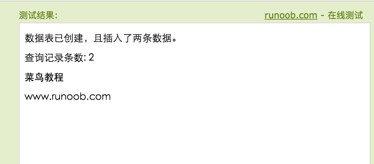 var db = openDatabase('mydb', '1.0', 'Test DB', 2 * 1024 * 1024); var msg; db.transaction(function (tx) { tx.executeSql('CREATE TABLE IF NOT EXISTS LOGS (id unique, log)'); tx.executeSql('INSERT INTO LOGS (id, log) VALUES (1, "菜鸟教程")'); tx.executeSql('INSERT INTO LOGS (id, log) VALUES (2, "www.runoob.com")'); msg = '<p>数据表已创建,且插入了两条数据。</p>'; document.querySelector('#status').innerHTML = msg; }); db.transaction(function (tx) { tx.executeSql('SELECT * FROM LOGS', [], function (tx, results) { var len = results.rows.length, i; msg = "<p>查询记录条数: " + len + "</p>"; document.querySelector('#status').innerHTML += msg; for (i = 0; i < len; i++){ msg = "<p><b>" + results.rows.item(i).log + "</b></p>"; document.querySelector('#status').innerHTML += msg; } }, null); });