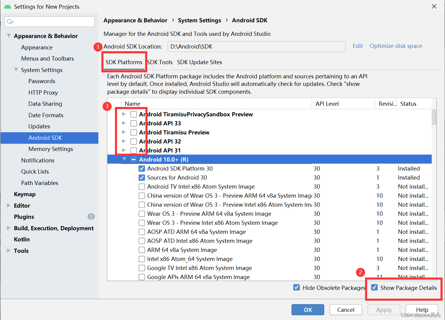 2.进入SDK Manager后,点击SDK Platforms-->Show Package Details,取消勾选API 33。