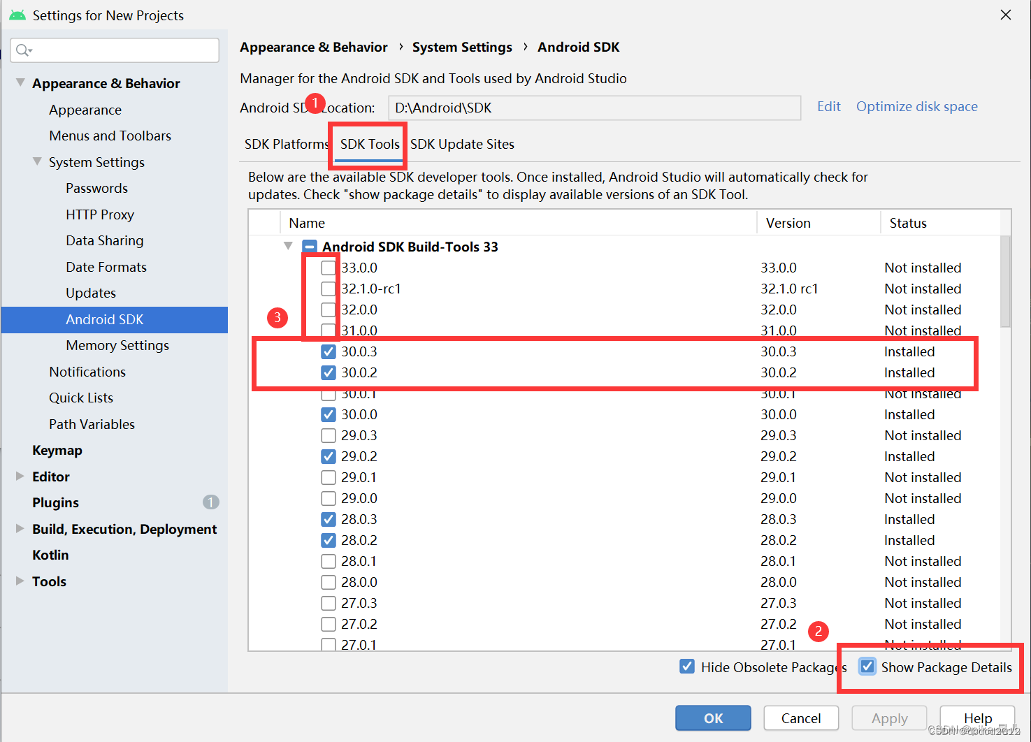 3.点击SDK Tools-->Show Package Details,取消勾选33.0.0并选择30.0.3版本或者更低的版本后点击Apply-->OK。